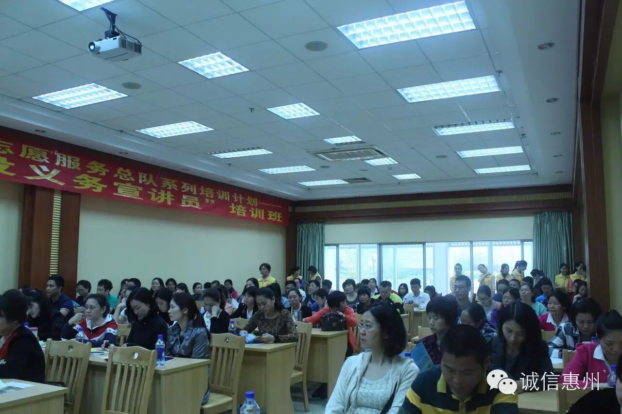 2016年4月14日下午,由惠州市企业诚信建设促进会主办的“我是诚信建设义务宣传员”公益培训,在惠州市慈云图书馆顺利举行。本次活动邀请了惠州市政府接待办综合科科长申思女士、中国出口信用保险公司惠州办事处负责人胡俊枫女士、惠阳区原社科联主席王国强先生为大家做公益宣讲,在惠州市志愿服务联合会指导下,在广大志愿者积极参与下,宣讲会取得了圆满成功!