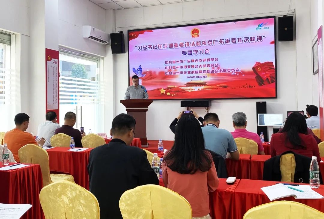 为深入学习贯彻习近平总书记出席深圳经济特区建立40周年庆祝大会和视察广东重要讲话、重要指示精神,2020年11月24日,中共惠州市企业诚信建设促进会党支部联合中共惠州市广告协会党支部、中共惠州市酒业协会党支部组织召开“习总书记在深圳重要讲话和视察广东重要指示精神”的专题学习会。